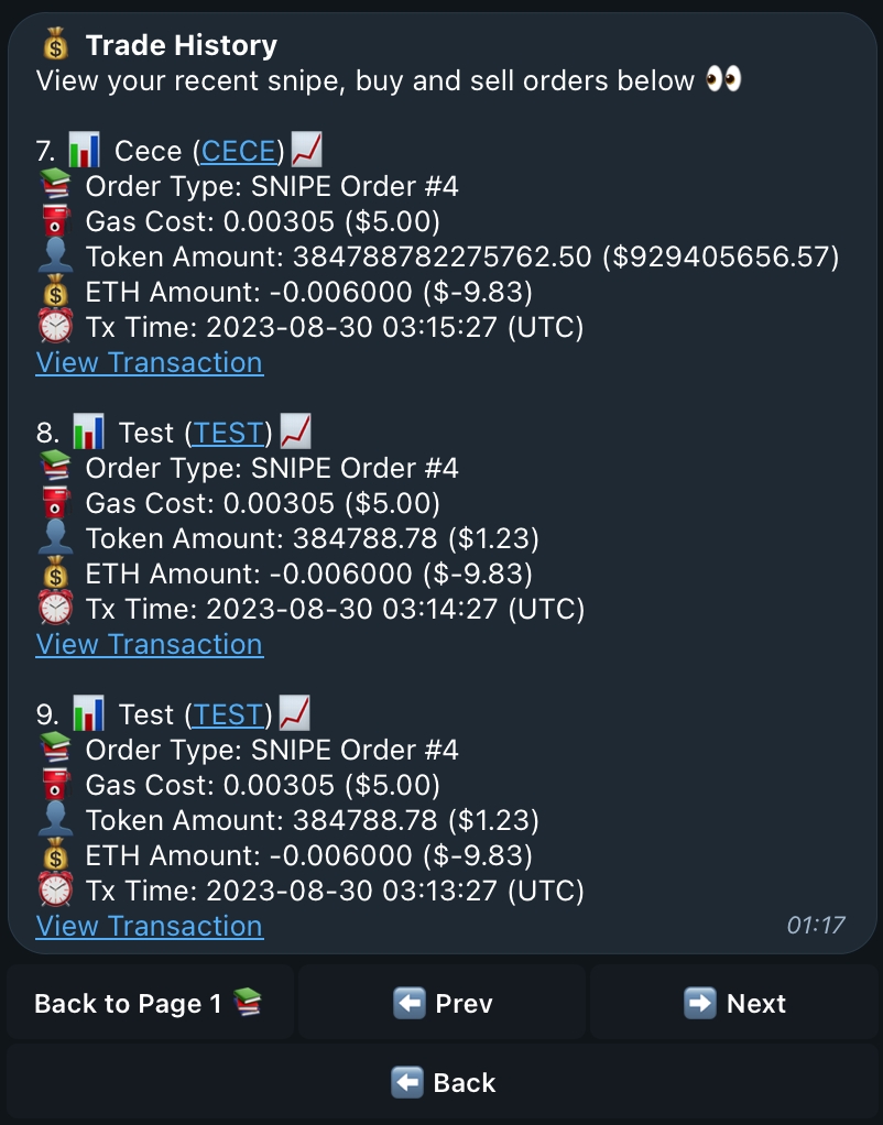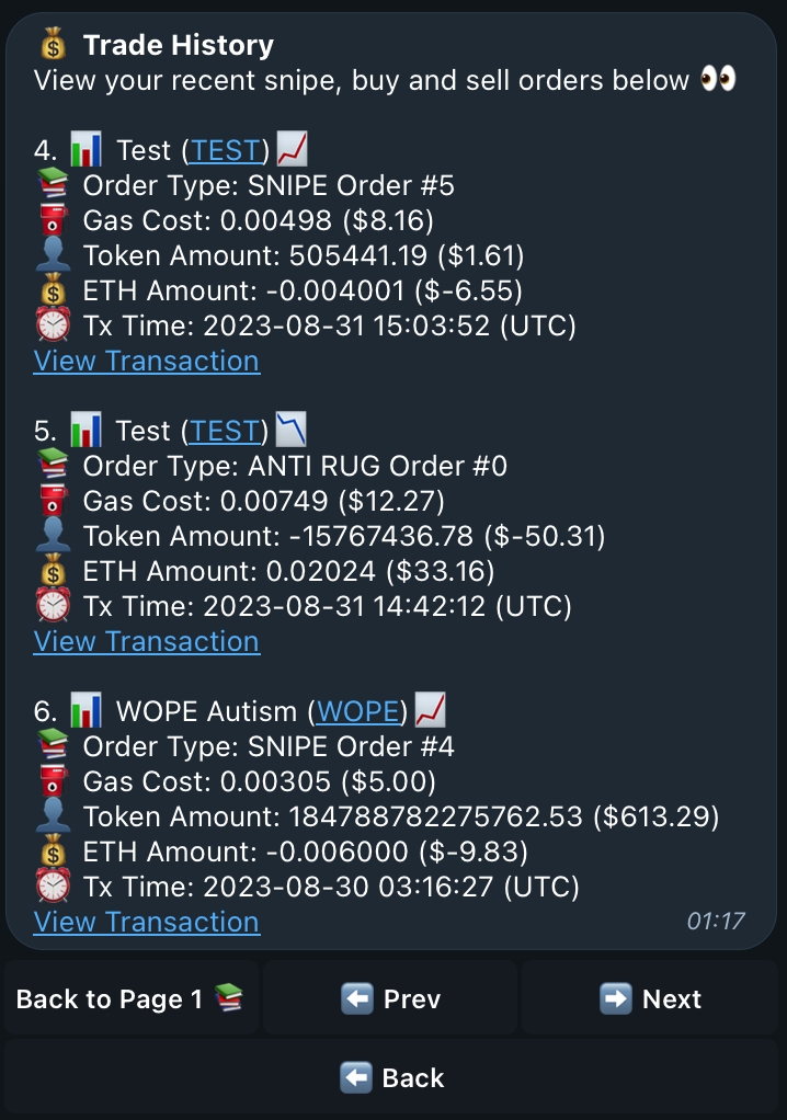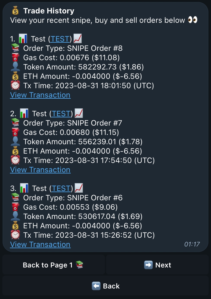 Welcome to your trade history! Every Limit Order, Market Order and Snipe will display on your trade history will each order's important information and a link to the transaction on Etherscan! There will be 3 trades shown per page so they are easily viewable without making too long of a message - don't worry if yours doesn't look like this, thats because you haven't made any trades yet or have under 3 trades and can only see one page!
