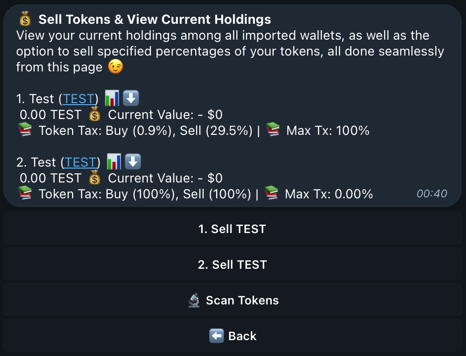 After making the selection on the home page, you will be greeted with a list of your current holdings among all wallets imported within the bot. From here, we can see the token's ticker, a quick link to the tokens contract address, your current holdings, the current value of the token and the transaction taxes this token may have. ๐Ÿ’ฐ