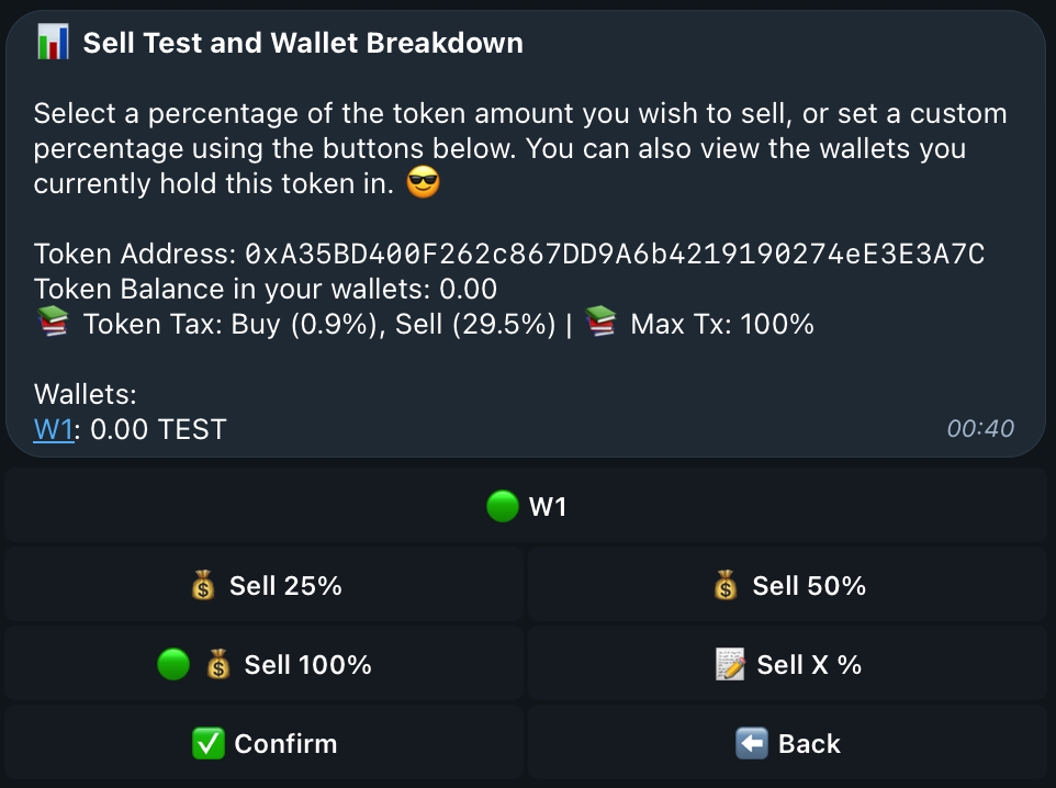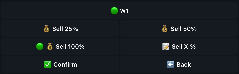 Now, let's explain the different buttons on the selling page! Preset for you, the option to sell 25%, 50% or 100% of the token you have selected! If these options aren't suited for you, the button "๐Ÿ“ Sell X %" allows you to specify a percentage of your choice that you wish to sell of the token.