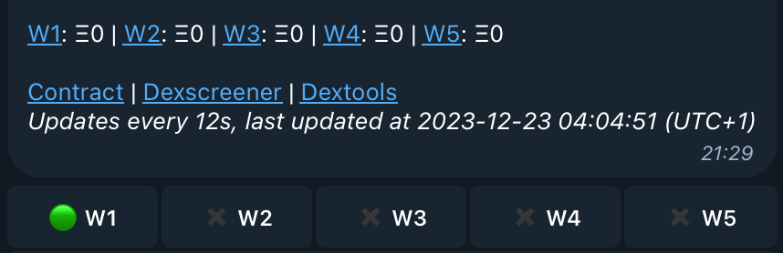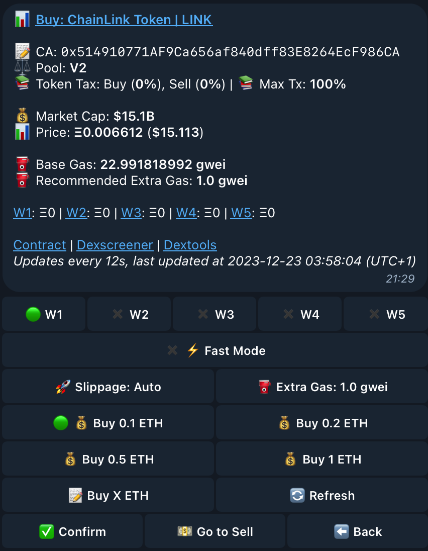 After providing the **contract address** of the token you wish to purchase, you will be greeted with this message below. This message will indicate to you all **relevant information** about the token you have provided, including: **Contract Address, Liquidity Pool Version, Buying and Selling transaction taxes, market cap and the current price.** All this information is updated and refreshed automatically every 12 seconds, the last refresh is viewable at the bottom of the message.