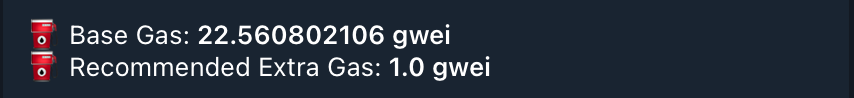 Base Gas and Recommended Extra Gas values are provided in the main message, as shown below. If you have no need for your transaction to be sped up, just ignore the extra gas button and continue on with your trading! However, if you wish for a super fast confirmation, you can supply the extra gas value yourself or use our pre-calculated priority amount! ⚡️&#x20;