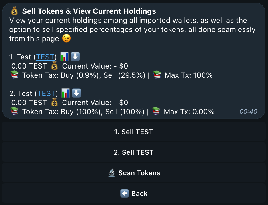 After making the selection on the home page, you will be greeted with a **list of your current holdings** among all wallets imported within the bot. From here, we can see the **token's ticker**, a quick link to the **tokens contract address**, your **current holdings,** the **current value** of the token and **the transaction taxes** this token may have. 💰&#x20;
