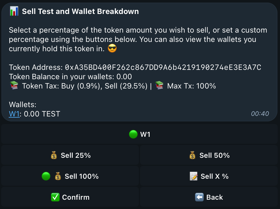 <figure><img src="https://i.gyazo.com/eedf7e4e76c45eac7fba752dabc12a9d.png" alt="" width="563"><figcaption><p>The 🟢 indicates your current chosen value, in this case, to sell 100% of the token as shown above ⬆️ </p></figcaption></figure>