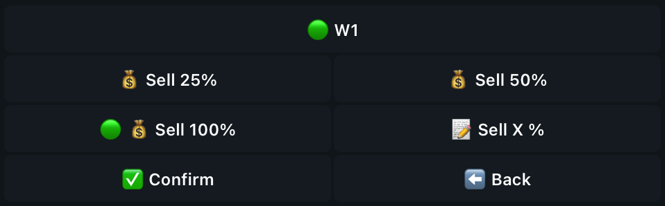 Now, let's explain the different buttons on the selling page! Preset for you, the option to sell **25**%, **50**% or **100**% of the token you have selected! If these options aren't **suited for you**, the button "📝 **Sell X %**" allows you to **specify a percentage** of your choice that you wish to sell of the token.