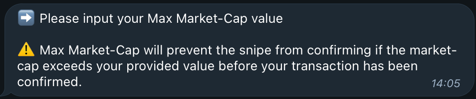 The Max Market-Cap setting acts as a failsafe for the snipe transaction. If the market-cap of the token you are sniping exceeds your chosen amount before your snipe transaction has confirmed, it will revert and cancel - further preventing any possible losses.&#x20;