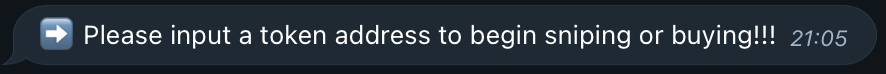 <figure><img src="https://i.gyazo.com/83e1714ac2b94cd22d9dfcf215b45ae4.png" alt="" width="563"><figcaption><p>Provide the contract address of the token you wish to snipe with this message shown above. 💰 </p></figcaption></figure>