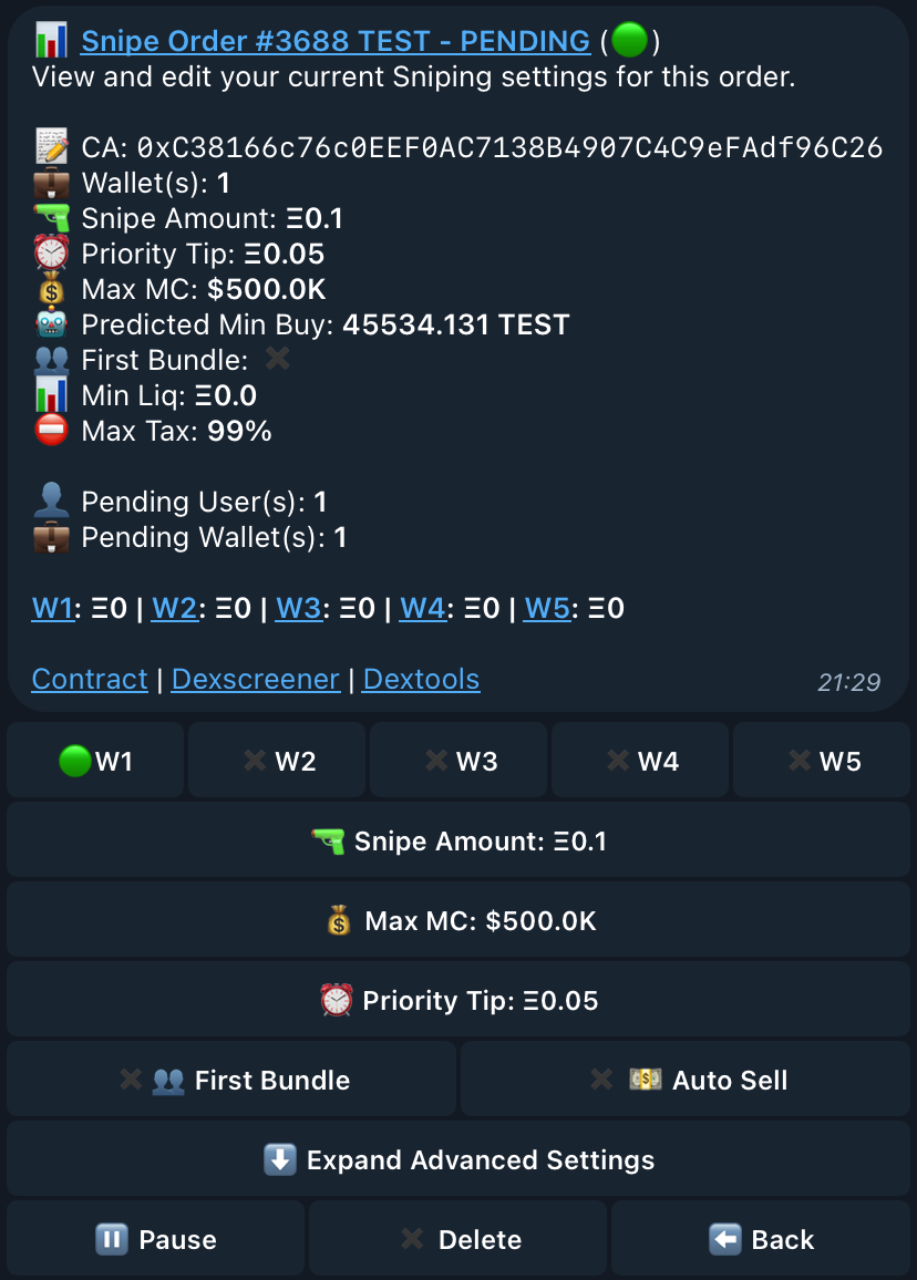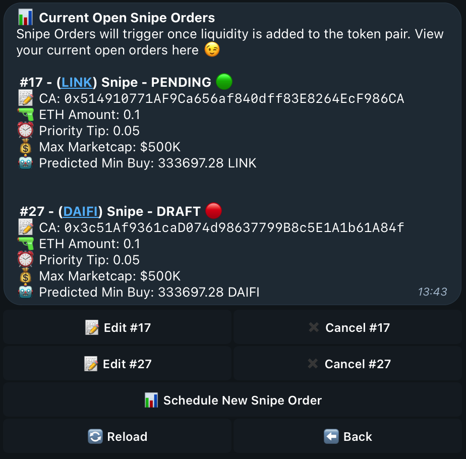 From here, you can view all your **current queued snipe orders**, as well as **edit them, cancel them** and **schedule new orders**. Each order will display its relevant information, such as the **status, token name, contract address, snipe amount, priority tip, max market-cap** and a **simulated minimum purchase amount**.