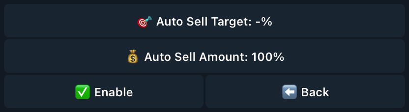 Auto-Sell does exactly what it says it does! Having this toggled will provide two new settings to be configured. No need to stare at the chart after sniping when you have Auto-Sell toggled as it will sell your desired token amount at your specified percent increase!&#x20;