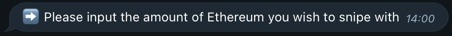 <figure><img src="https://i.gyazo.com/ce90c4ea286ba15daee6fbcedfd328ad.png" alt="" width="563"><figcaption><p>Respond to this message with the Ethereum value that you wish to use to snipe. (Example: 0.5)  </p></figcaption></figure>
