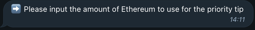 <figure><img src="https://i.gyazo.com/d3667898821ab08fc043f2a93135dbef.png" alt="" width="563"><figcaption><p>Respond to this message with the Ethereum amount you wish to use as your priority tip (Example: 0.1)  </p></figcaption></figure>