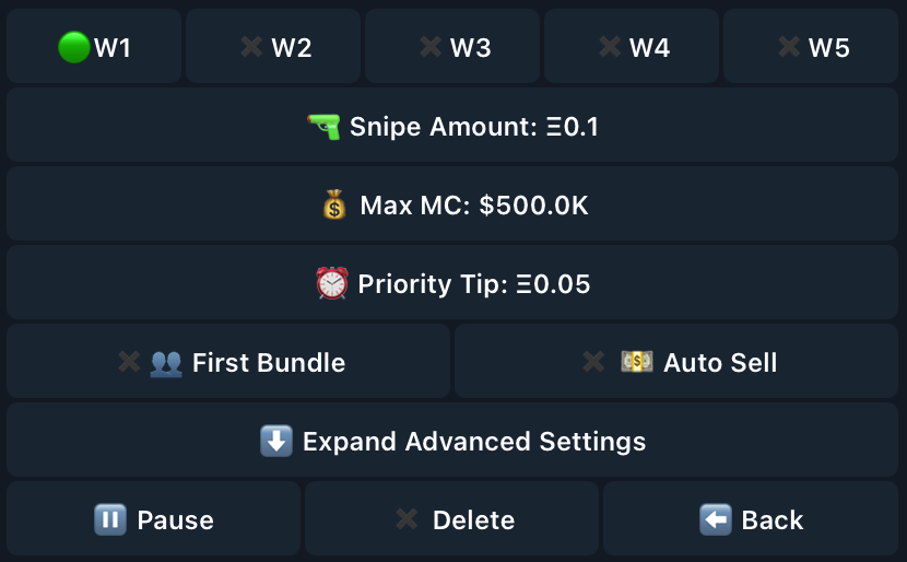 These buttons will assist you in **changing the wallet(s)** used for the snipe, the **snipe amount,** **max market-cap,** the **priority tip** you wish to use, **toggling First Bundle and Auto-Sell** as well as some **special advanced settings**. Looter will allow you to select **multiple wallets** to snipe from, which is a common tactic used in listing sniping.&#x20;