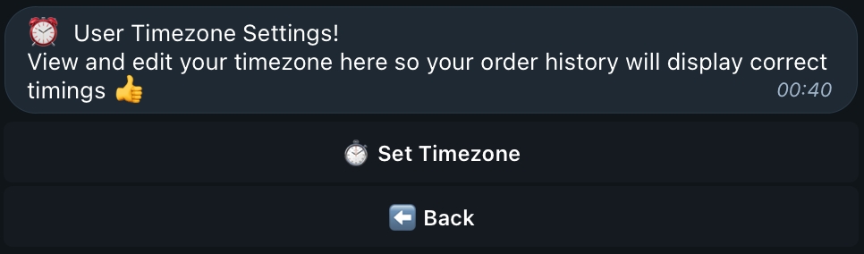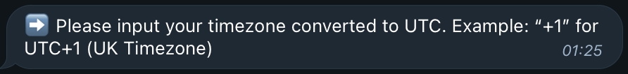 Changing your timezone is done in plus and minus values based on the UTC timezone. As shown in the message above, UTC+1 is the timezone for the United Kingdom and to get the UK timezone within the bot, you simply just supply "+1" as the response to this message. After supplying your plus or minus value, your timezone will update and reflect in your User Settings and Trade History! β°