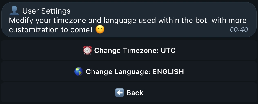 After navigating yourself to the User Settings page, you will be greeted with this message, where you can view your current settings and change your timezone and language within the bot! These are the current personalisation features we offer, but are always looking to include more! If you have any ideas you think would be a worthy addition to the bot, get our attention in the Telegram channel!