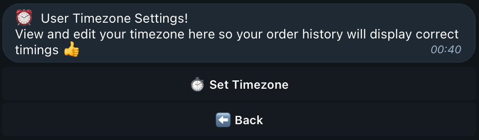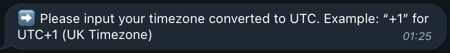 Changing your timezone is done in plus and minus values based on the UTC timezone. As shown in the message above, UTC+1 is the timezone for the United Kingdom and to get the UK timezone within the bot, you simply just supply "+1" as the response to this message. After supplying your plus or minus value, your timezone will update and reflect in your User Settings and Trade History! ⏰&#x20;
