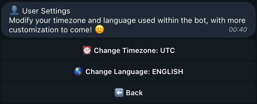 After navigating yourself to the **User Settings page**, you will be greeted with this message, where you can view your current settings and **change your timezone** and **language** within the bot! These are the current personalisation features we offer, but are **always looking** to include more! If you have any ideas you think would be a worthy addition to the bot, **get our attention** in the Telegram channel!&#x20;