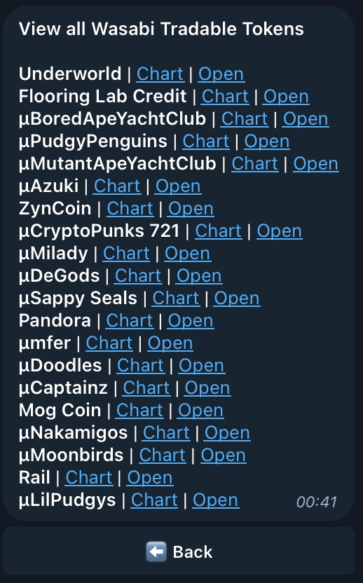 Trading with Wasabi on Looter is easy! Provided is a list of all currently tradable tokens, their chart links and a quick-access button to begin an order from within Looter.