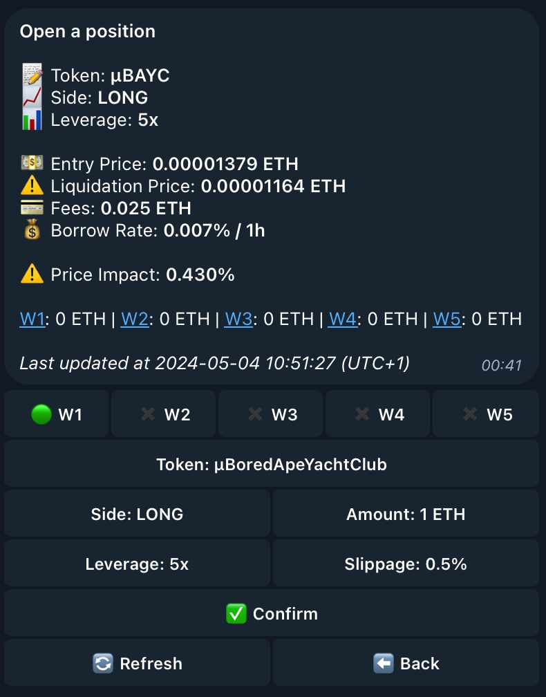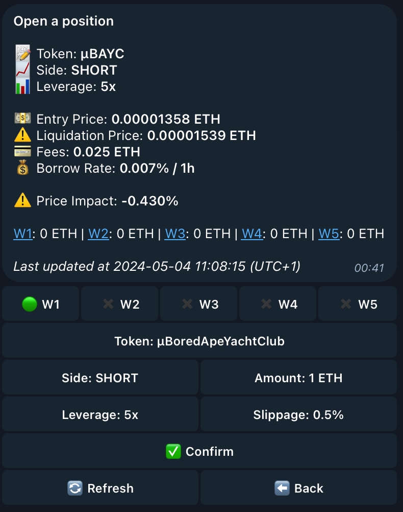 Let's dive into it! Select "Open" on the supported tradable NFT of your choice and displayed will be all the relevant information to your order, such as; the name of the tradable NFT token, order type (SHORT/LONG), leverage multiple, entry price, liquidation price, order fees, borrow rate and the price impact on the order.